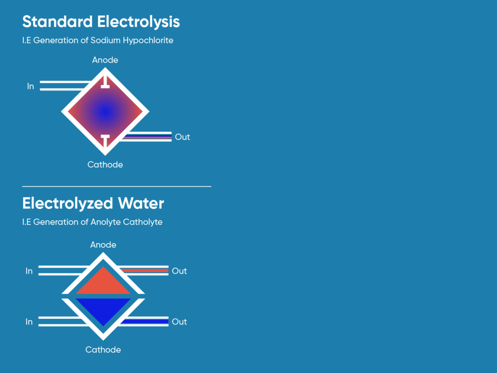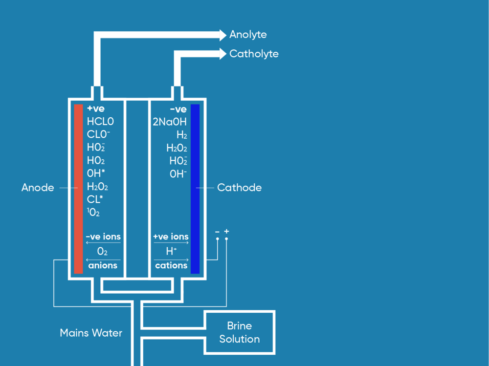 Our patented Envirolyte ® technology takes salt brine and runs an electrical current through it within a specially designed chamber. This generates a collection of negatively charged and positively charged ions, which are concentrated into two streams. The Anolyte stream contains hypochlorous acid and an amorphous mixture of other negatively charged ions which together make a potent disinfectant. The Catholyte stream is largely sodium hydroxide which can be used in caustic cleaning.